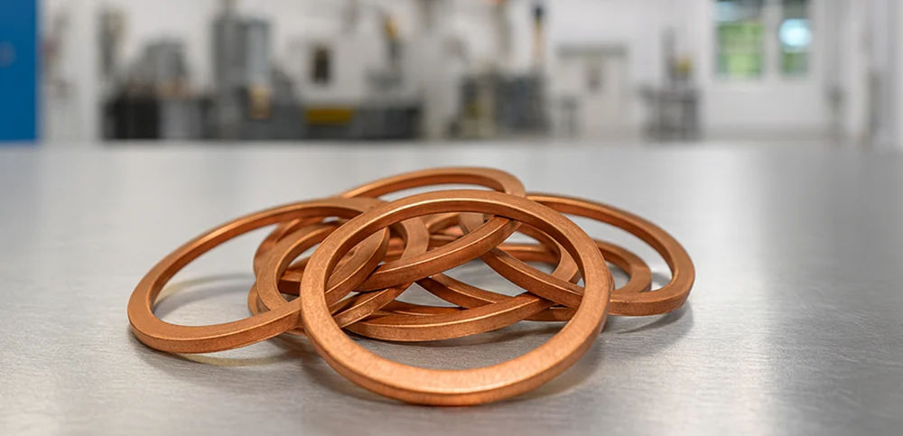Kupferringe (auch Crush-Washer oder Flächenpressdichtungen) sind metallische Dichtungsringe, die bei der Montage leicht plastisch verformt werden, um Unebenheiten auszugleichen und eine dichte Verbindung herzustellen. Sie eignen sich besonders in Anwendungen mit moderaten Drücken und Temperaturen oder dort, wo metallische Dichtungen bevorzugt werden (etwa bei hohen Temperaturen oder in Vakuumsystemen).